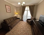 В номере имеется: три телевизора, телефон, три сплит-системы, сейф. В гостиной: раскладывающийся диван, два кресла, журнальный столик, комод с барным холодильником, горка с чайным сервизом и набором бокалов, письменный стол, одна спальня оборудована французской кроватью, другая - двумя раздельными кроватями, в каждой спальне - шифоньер, трюмо, два кресла и журнальный столик.